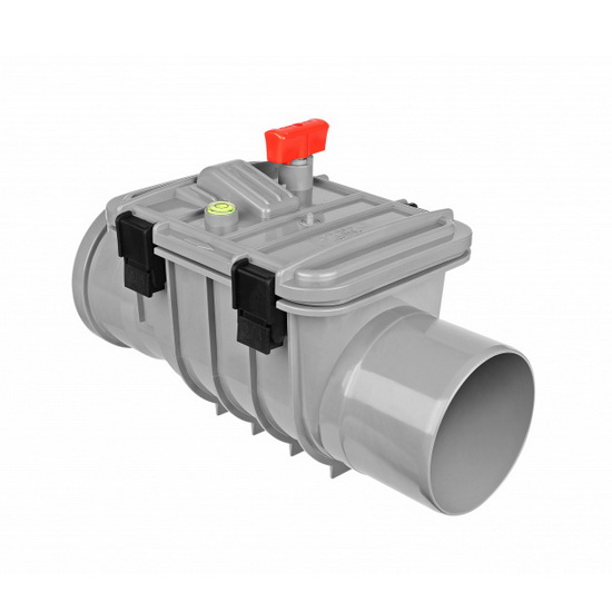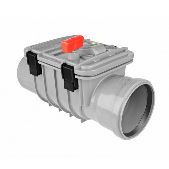 Обратный клапан PRO AQUA Comfort 110 мм серый. Обратный клапан PRO AQUA Comfort защищает от обратного тока сточных вод в канализационных системах. При сливе напор воды открывает заслонку, а после прекращения потока она автоматически закрывается, предотвращая затопление. Клапан оснащен ручной блокировкой заслонки и ревизионным люком для обслуживания и прочистки труб. Простая и надежная конструкция обеспечивает эффективную защиту помещений от канализационных подтоплений.