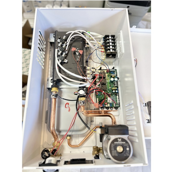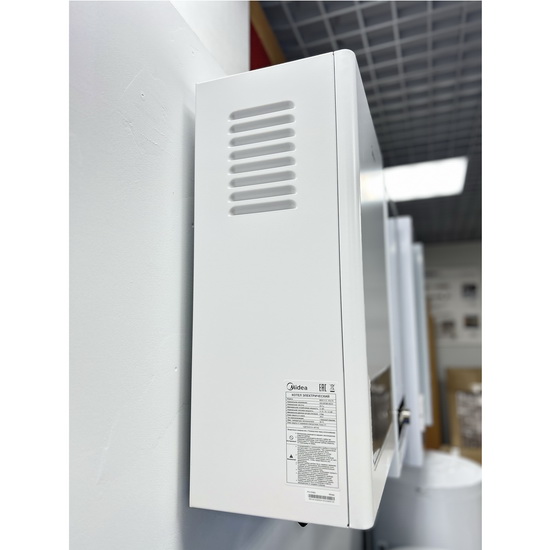 Электрический котёл отопления MIDEA MEB 5-12 VOLTA. Электрический котёл отопления MIDEA представляет собой надежное, производительное и компактное решение для обогрева различных помещений. Котел оснащен функцией удаленного управления через Wi-Fi, что позволяет легко контролировать его работу. Расширительный бак устройства имеет объем 6 литров, а класс защиты от влаги и воды соответствует стандарту IPX1. Номинальная тепловая мощность котла составляет 8 кВт, обеспечивая эффективный обогрев. Прибор поддерживает настройки температуры теплоносителя: в режиме "теплый пол" диапазон составляет от 30 до 60°C, а в режиме радиаторного отопления — от 30 до 85°C.