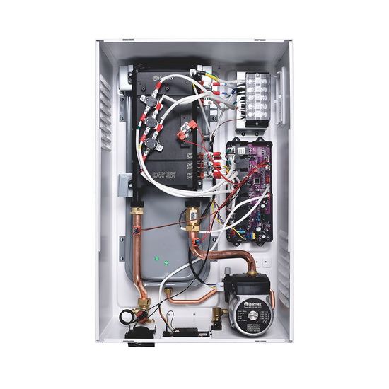 Электрический котёл Thermex Boss 12 Wi-Fi White. Электрический котёл Thermex Boss китайского производства, выполненный в белом цвете, предназначен для нагрева теплоносителя в системах отопления бытовых помещений. Котёл оснащён следующими индикаторами: перегрева (светится при нагреве, мигает при аварии), давления (горит при норме, мигает при отклонениях), защиты от замерзания (активен при работе функции), работы насоса (показывает активность или сбой насоса), нагрева (мигает во время нагрева) и Wi-Fi (отображает статус подключения).