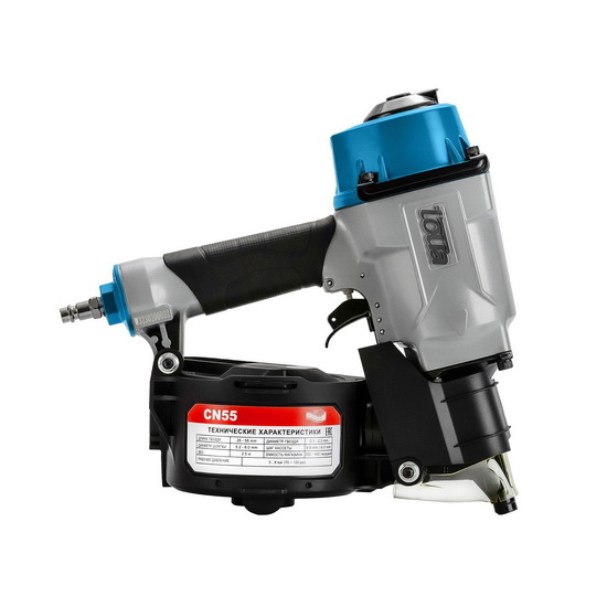 Пневматический гвоздезабивной пистолет Toua CN55. Пневматический гвоздезабивной пистолет Toua предназначен для работы с различными типами гвоздей, соединёнными проволокой – гладкими, ершеными и винтовыми. Длина гвоздей 25 - 55 мм. Отличается исключительной производительностью, увеличенным рабочим ресурсом и экономичной стоимостью каждого крепления, что делает его идеальным решением для промышленного производства и конвейерной сборки. Пистолет эффективен при использовании в паллетном и мебельном производстве, где требуется работа с горизонтально расположенными материалами.