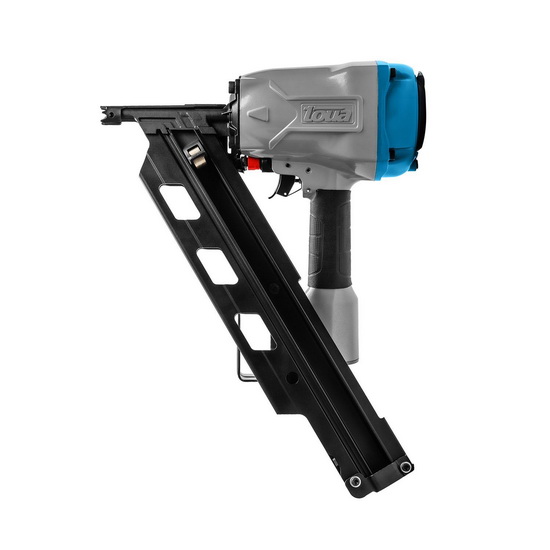 Пневматический гвоздезабивной пистолет Toua FN3490. Пневматический гвоздезабивной пистолет Toua предназначен для быстрой и качественной сборки различных деревянных конструкций. Пистолет эффективно работает с реечными гвоздями длиной от 50 до 90 мм на кассетах с углом наклона 34 градуса, поддерживая различные типы крепежа: гладкие, с кольцевой или винтовой накаткой. Основные области применения включают возведение каркасов деревянных домов, монтаж обрешетки и контр-обрешетки, установку OSB-плит и фанеры, сборку стропильных систем, а также работу с SIP-панелями.